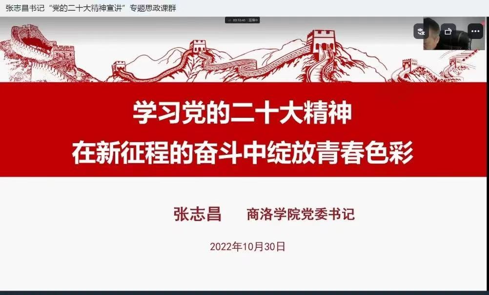 为教育引导广大师生深入学习领会党的二十大精神,推动党的二十大精神在校园落地落细落实,10月30日14:00,校领导张志昌通过钉钉在线直播方式,为我院全体学生、辅导员宣讲党的二十大精神。