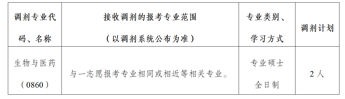 根据2026年报考我院生物与医药硕士研究生考生初试成绩上线及招生名额情况,结合我院第一批调剂考生报考及复试情况,我院接收第二批次调剂,现将调剂安排通知如下: